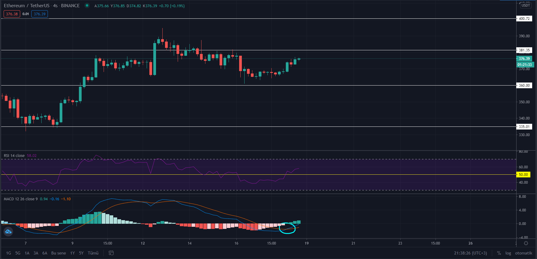 Yayın saati itibariyle 370 dolar üzerinden alıcı bulan ETH için 4 saatlik grafikte dirençler olarak 381 ve 400 dolar seviyeleri, alta baktığımızda ise 360 ve 335 dolar seviyeleri destekler olarak bizi karşılıyor.