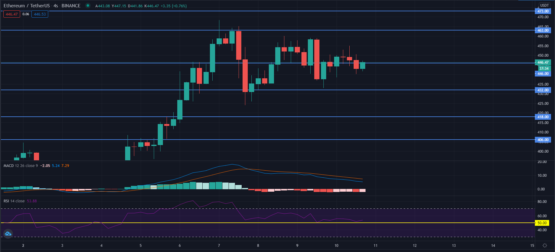 Haftaya 454 dolar gibi iyi bir seviyeyle başlayan ETH, yayın saati itibariyle 446 dolardan alıcı buluyor. ETH, 454 dolarlık açılışla birlikte haftalık grafikte yükselen tepe açılışı yapmış bulunuyor.