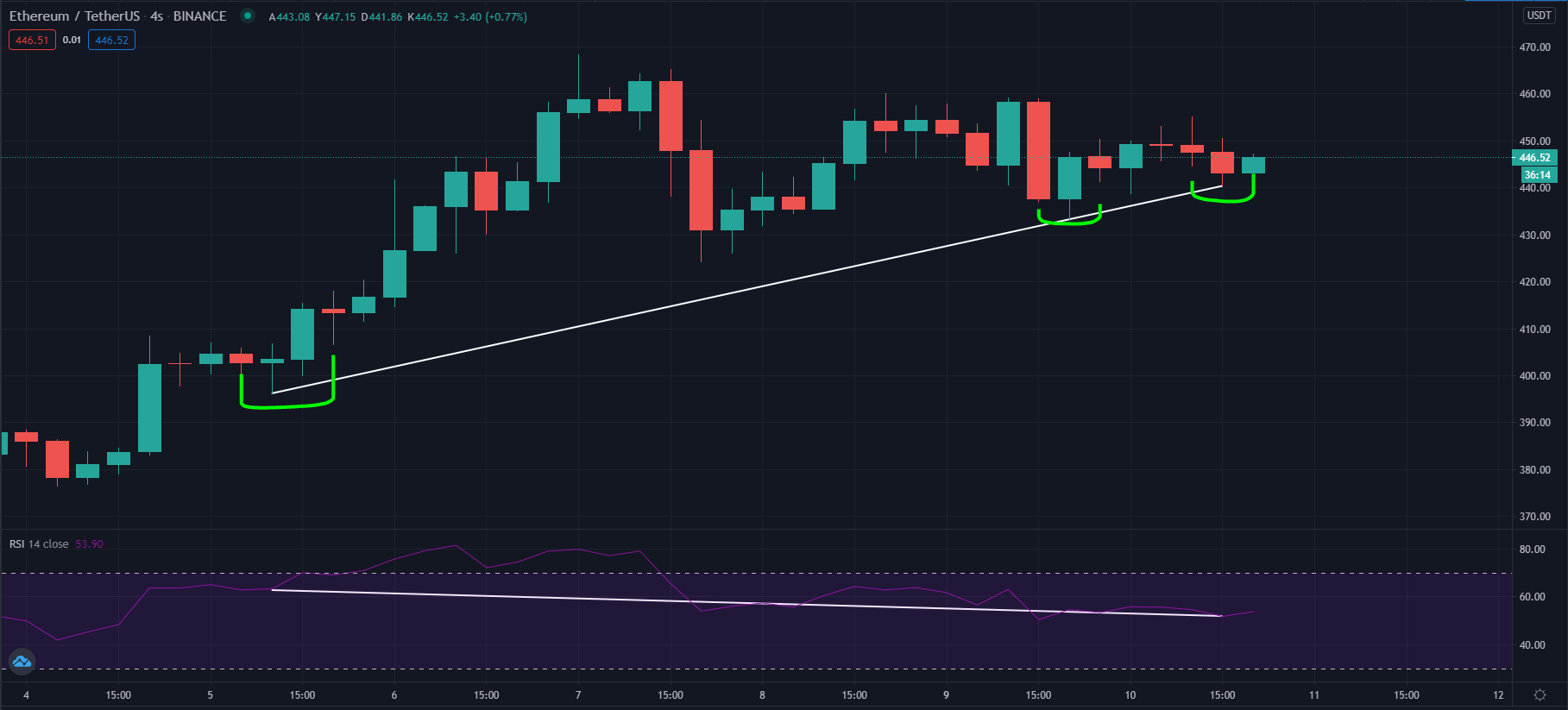 İlk başta da belirtildiği üzere Ethereum haftaya güzel bir seviyede başladı. Haftalık ETH/USDT grafiğinde göze çarpan ayrıntı, yükselen trendi gösteren yükselen dipler oluyor. Mart ayından bu yana fiyatta devam eden bu yükselen dipleri, aynı şekilde yükselen dipler yapan RSI indikatörü takip ediyor.