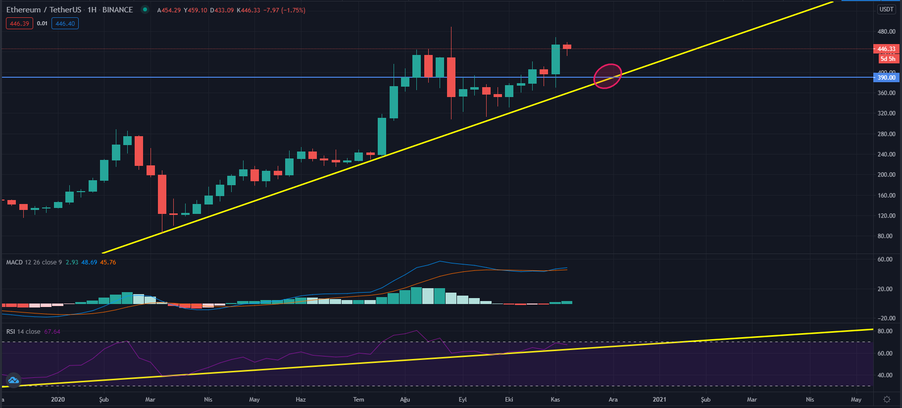 ETH fiyatında olası bir geri çekilmede görülebilecek seviye, alt trend ile kesişen ve önemli bir seviye olan 390 dolar seviyeleridir. Uzun vadeli olarak düşünen yatırımcılar bu trend çizgisine dikkat edebilirler. Şayet bu trend çizgisine olabilecek bir ziyaret sonrası fiyat toparlanırsa çok büyük bir ralliye doğru ilerleyebiliriz.