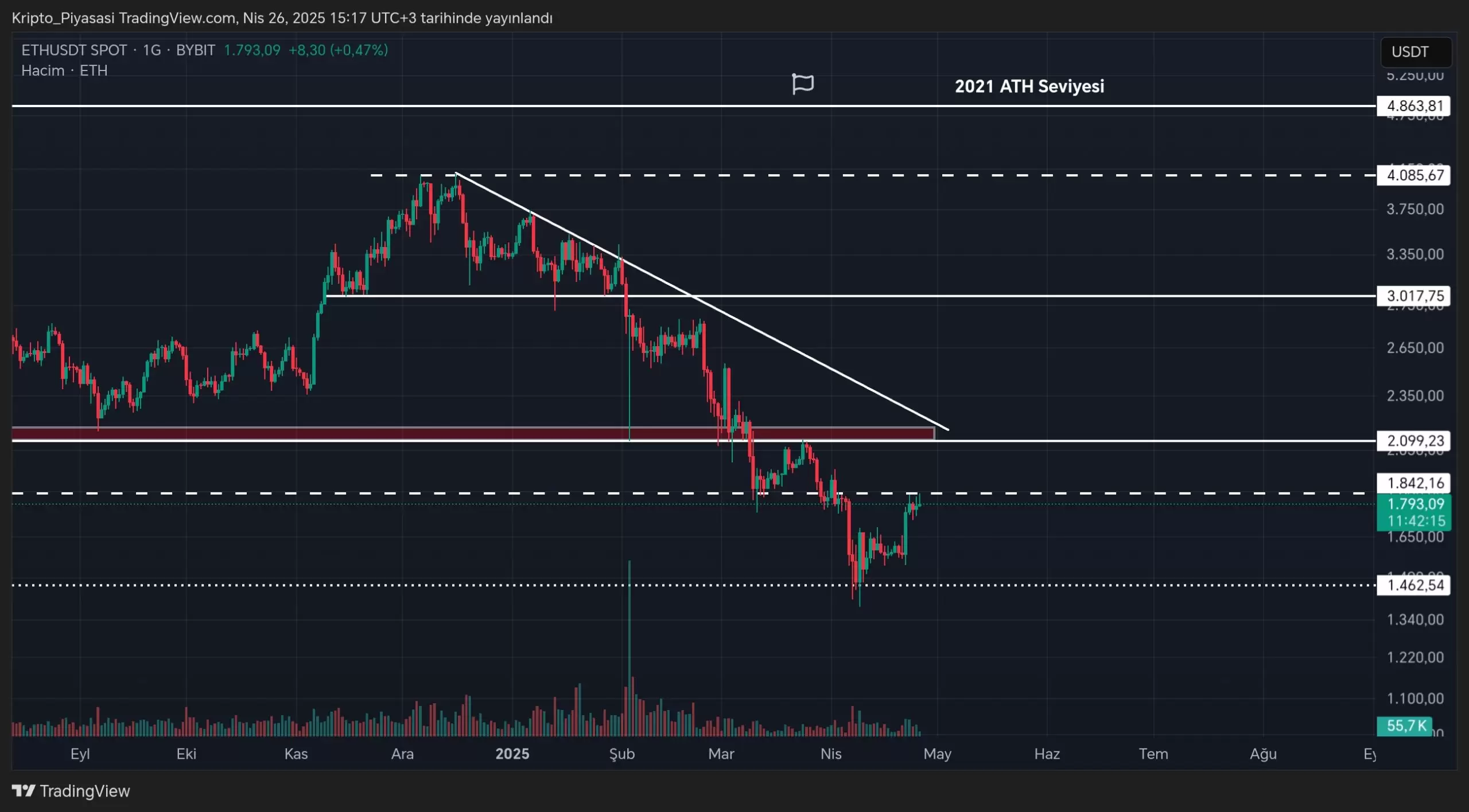 Ethereum (ETH) önümüzdeki süreçte 1.842 dolar direncini aşması halinde 2.100 doları hedefleyecektir. Yatırımcıların çok uzun bir süredir beklediği ETH sezonu ise 2.150 doların üzerinde bir kalıcılık sağlanması halinde başlayabilir.