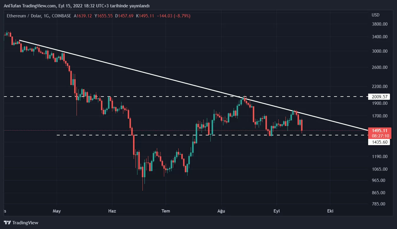 1500 doların altına sarkmasının ardından kritik bir destek noktası olan 1435 dolara yaklaşan ETH, ilerleyen saatlerde bu destek noktasının da altına sarkabilir.
