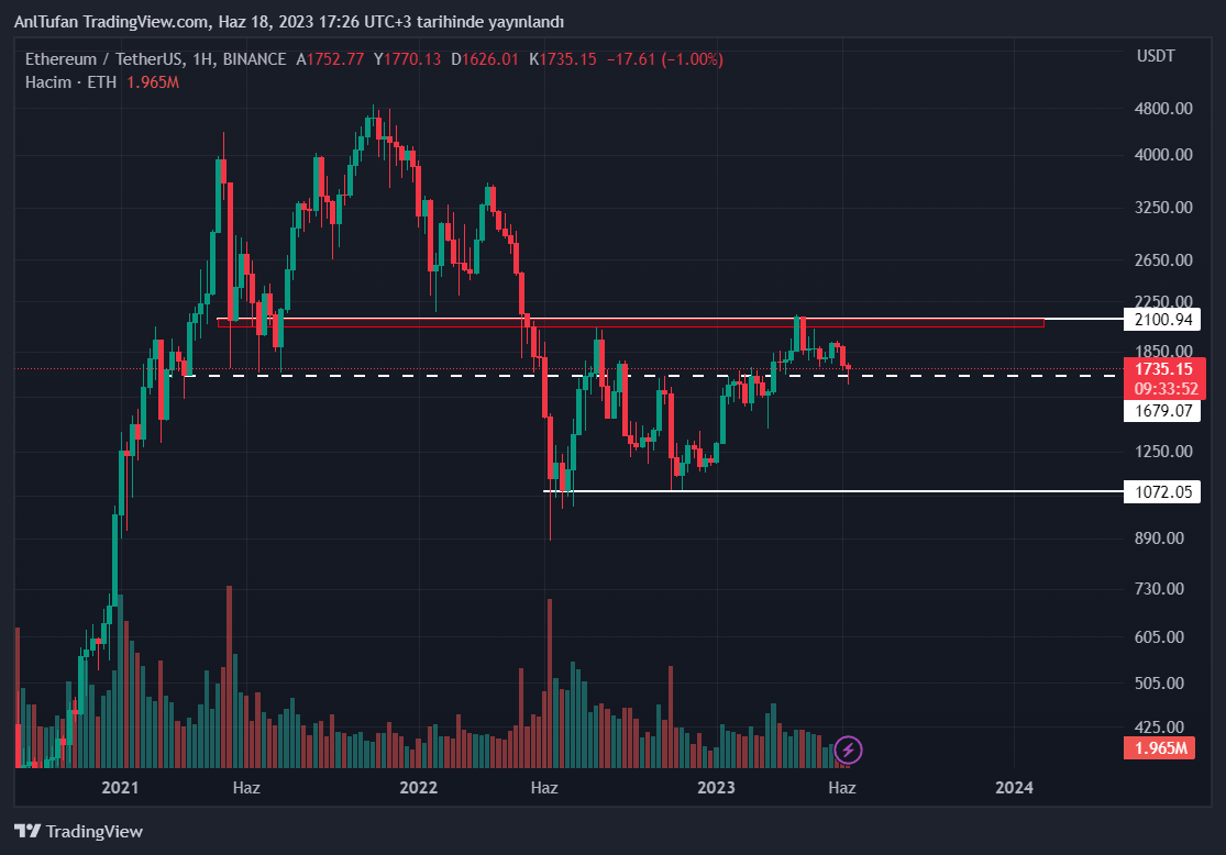 Lider altcoin Ethereum haberimizin yazıldığı esnada 1.735 dolar seviyelerinden işlem görüyor. ETH’nin haftalık mumu kırmızı olsa da, bir trend dönüşüm mum formasyonu oluştuğu gözlenmekte.