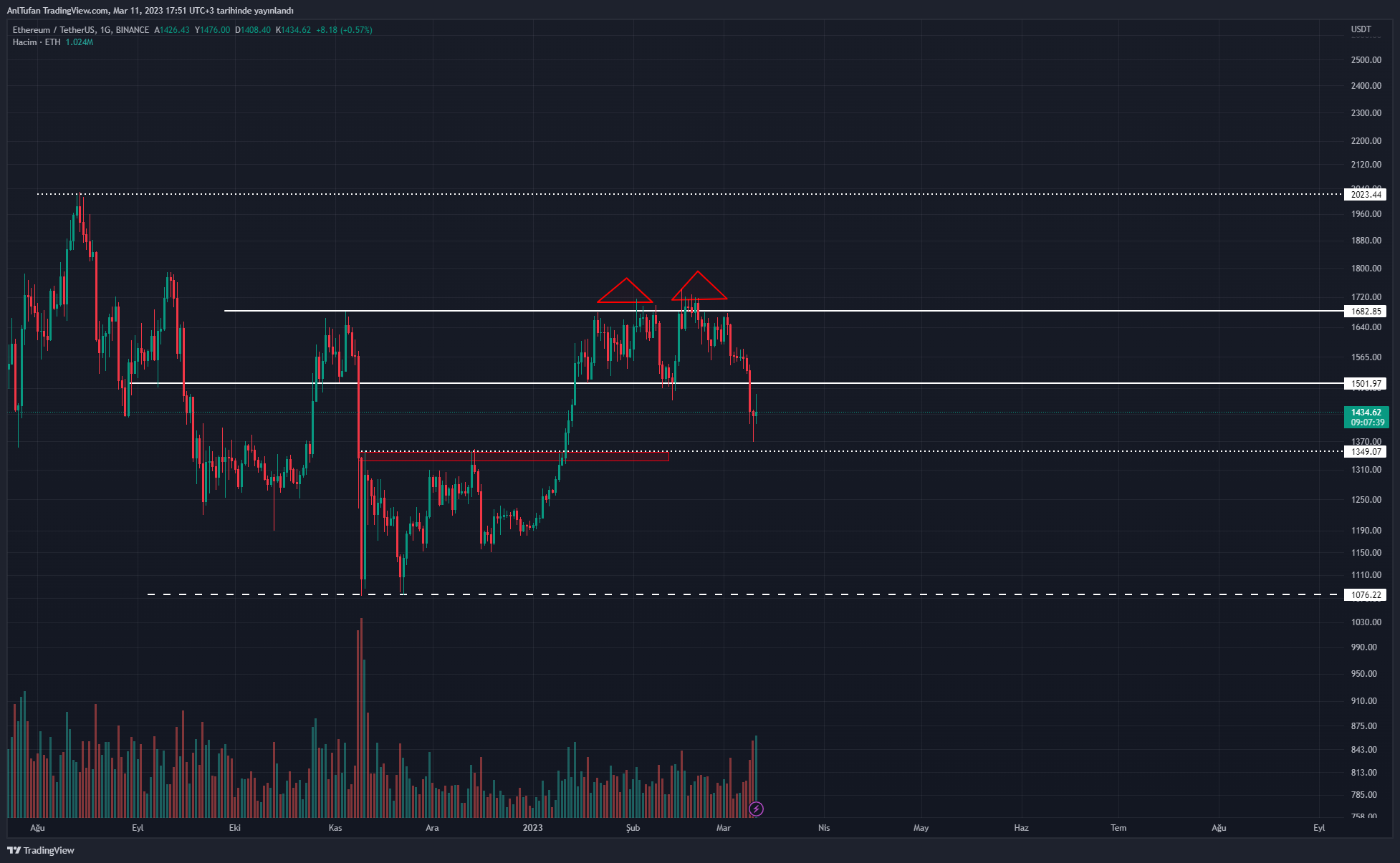 Ethereum’da haftalık kapanış öncesi bu 2 seviye takip edilecek. ETH’nin 1.500 dolar seviyesinin üzerinde bir kapanış yapması yükseliş getirebileceği gibi 1.350 doların altında kapanış yapması düşüş getirebilir.