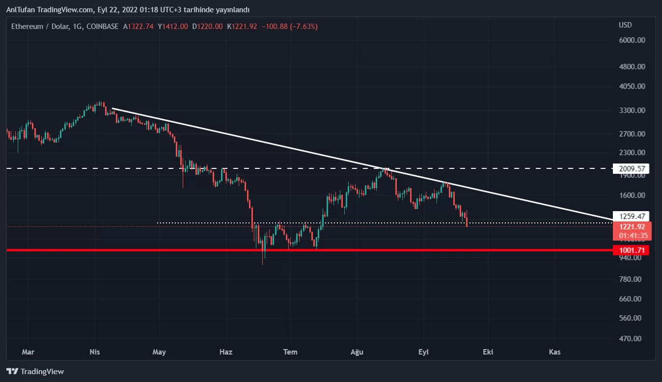 Merge birleşmesi sonrasında yüzde 25’den fazla düşüş yaşayan lider altcoin, kritik destek seviyesini kaybetmesiyle birlikte yarın itibariyle 1.000 dolar seviyesine gerilemesi beklenmekte.