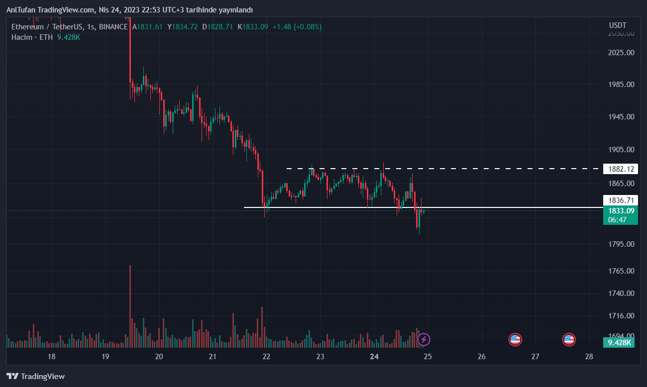 21 Nisan tarihinde 1.835 dolar desteğine kadar bir düşüş yaşayan ETH, son 3 gündür bu destek seviyesinin üzerinde akümüle oluyordu. Ayıların satıcı baskısının artması, bu desteğin kırılmasına neden oldu.