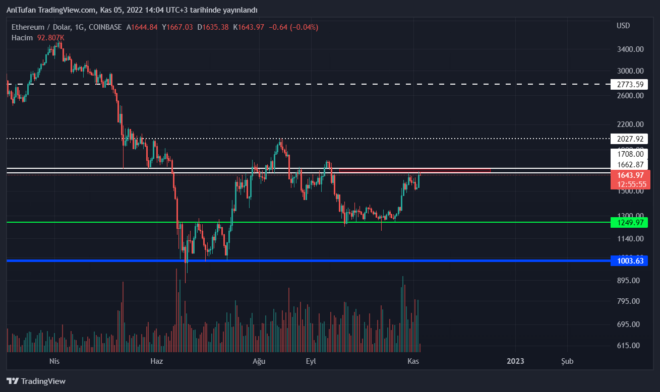 1.660 – 1.700 dolar direnç noktasının altında yukarı yönlü bir kırılım gerçekleştirmek için akümüle olduğu görülen ETH, bu bölgedeki satıcı baskısını aşması halinde volatil bir yükseliş trendi başlatabilir.