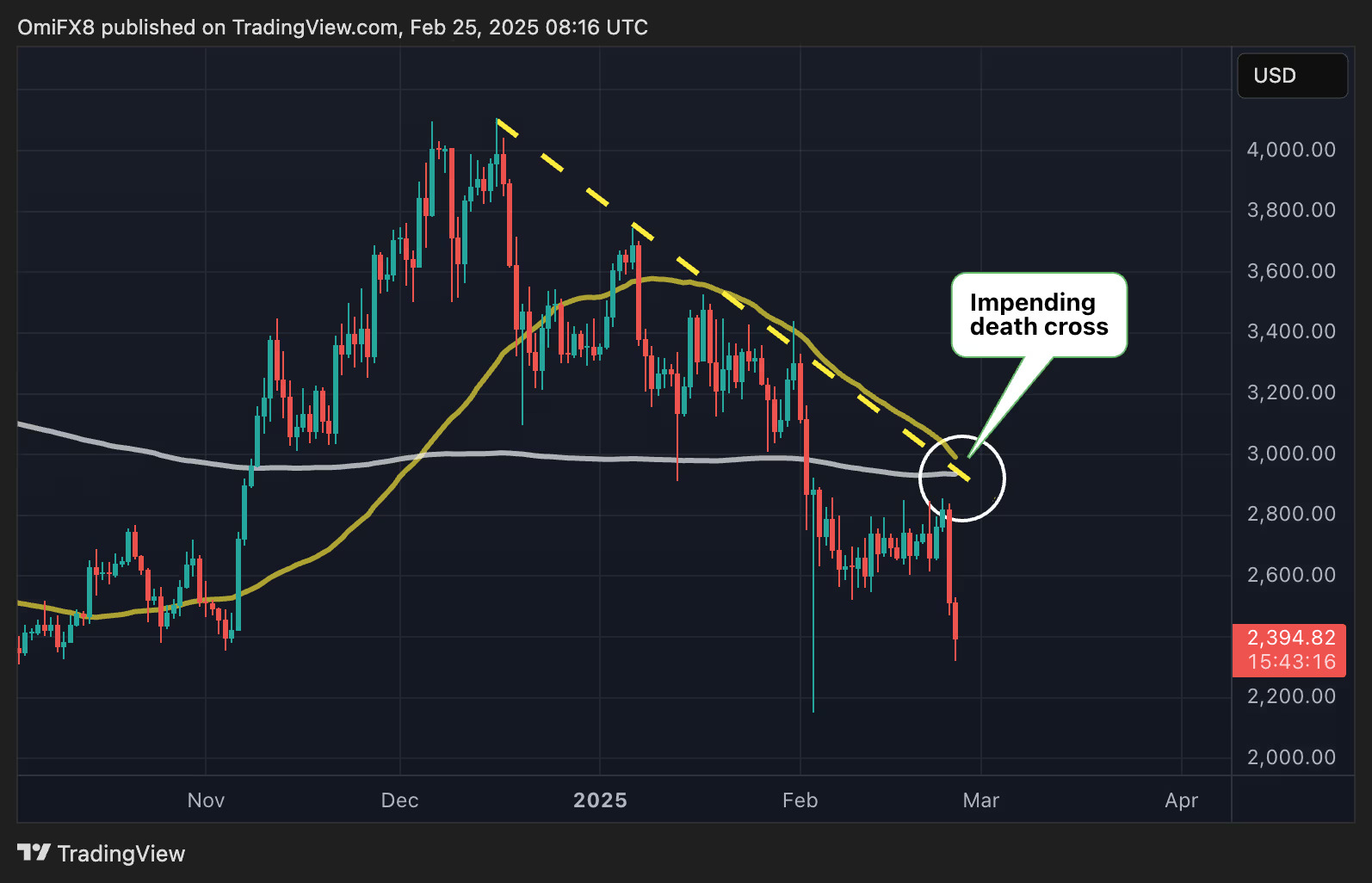Bugün itibariyle Ethereum’un %5 oranında değer kaybettiği görülüyor. Önümüzdeki süreçte ise ETH’de 50 günlük basit hareketli ortalama, 200 günlük SMA’yı aşağı yönlü kesebilir. Bu durum finans piyasalarında “ölüm kesişimi” olarak tanımlanıyor.
