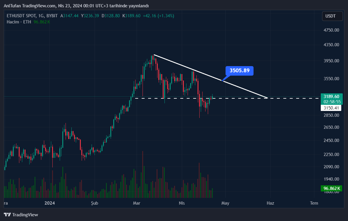 Lider altcoin Ethereum’un (ETH) günlük grafiğini incelediğimizde, 2 temaslı bir düşen trendin olduğu görülüyor. ETH önümüzdeki dönemde 3.500 dolar seviyelerine yükselerek bu düşen trendi deneyebilir.