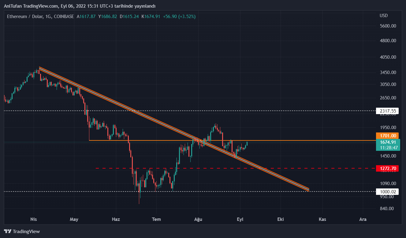 1700 doların aşılması ile birlikte ilk etapta Ethereum’un 2000 dolara yükselmesi beklense de, bu seviyedeki ara direncinde kırılacağı ve 2300 doların test edileceği tahmin edilmekte.
