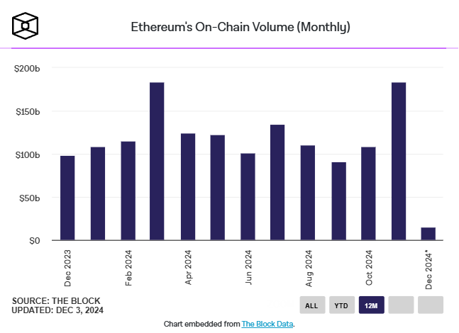Lider altcoin Ethereum‘un (ETH) Kasım ayındaki on-chain hacmi 183,74 milyar dolara ulaşarak yılın başından bu yana kaydedilen en yüksek aylık hacmine ulaştı. Bu, Aralık 2021’deki 241 milyar dolardan bu yana Ethereum’daki yaklaşık üç yılın en yüksek on-chain hacmini temsil ediyor.