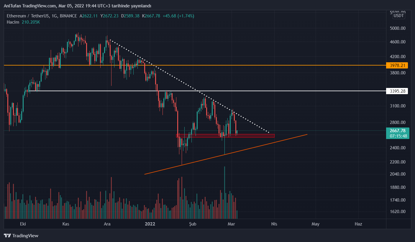2600 – 2500 dolar destek bölgesinin hemen üzerinde konumlanan Ethereum, yayın saati itibariyle 2650 dolar seviyelerinden işlem görüyor.