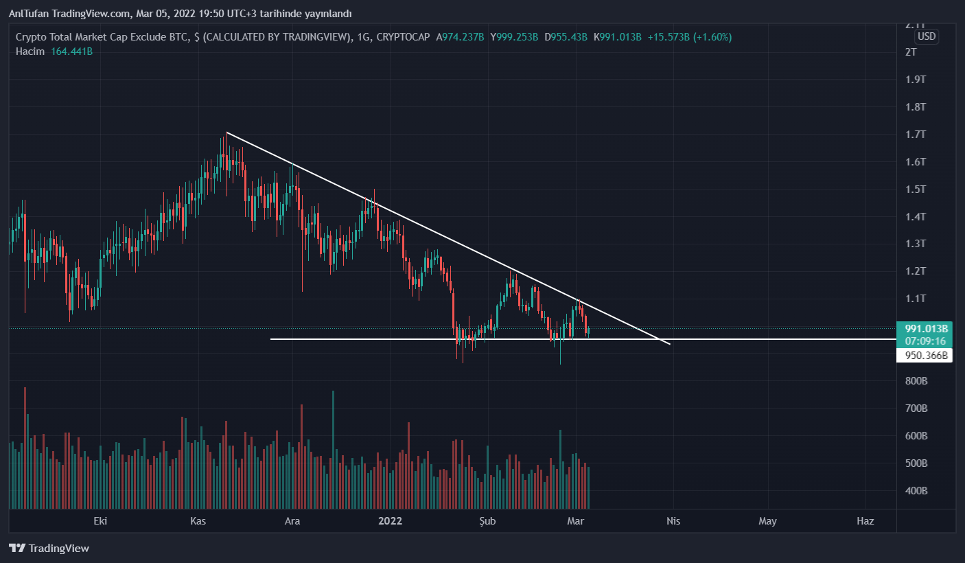 Altcoinlerin genel değerini gösteren Total 2 grafiği, uzun süredir 1 trilyon bandını kıramamış durumda.