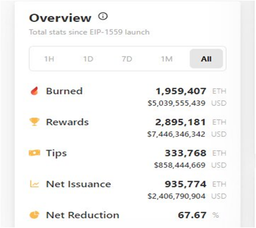 4 Ağustos 2021 tarihinde aktif edilen London hard forku ve EIP-1559 güncellemesinden bu yana işlem ücretleri üzerinden 1.959.407 ETH yakıldığı görülüyor.
