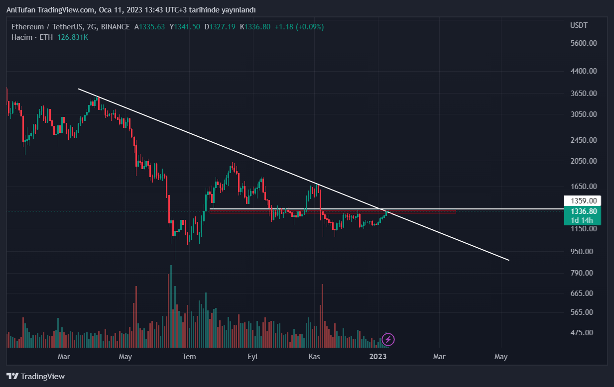 Şuan itibariyle ise Ethereum çok kritik bir direnç noktasına ulaşmış durumda. Birçok kez reddedildiği yatay direnç seviyesi olan 1.360 dolara yükselen ETH, an itibariyle major düşen trendine ulaşmış durumda.