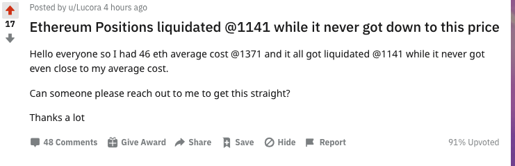 Ünlü trader ve analist Luca Maziere, bu sert düşüş yüzünden kaldıraçlı işlemlerde 46 ETH (yaklaşık 78.000 dolar) kaybettiğini vurguladı. Maziere bu konuda tek değil. Reddit üzerinde DumbesStableGenius isimli bir kullanıcı da hesabındaki fonların %50’sinin bu sert düşüş nedeniyle likidasyon yaşadığını ifade etti. Reddit üzerinde açılan konu başlığının altına gelen yorumlarda yatırımcıların borsaya karşı toplu dava açmaya hazırlandığı görülüyor.