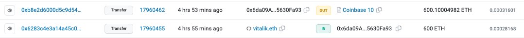 Ortalama 5 saat önce dev kripto para borsası Coinbase‘e 600 adet ETH transfer eden Buterin, 1 milyon dolar değerinde ETH satışı yapmış gibi duruyor.