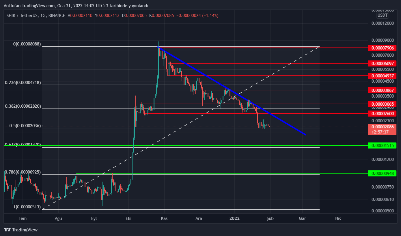 Bu destek seviyesini de kaybetmesi halinde sert düşüşler yaşayabilecek olan SHIB, 0.618 fibonacci seviyesi olan 0.00001470 dolar seviyesine bir düşüş yaşayabilir. 0.00001520 – 0.00001470 dolar desteğinde tutunması beklenen SHIB bu seviyelerde dip yapabilir.