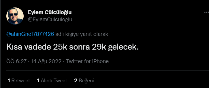 14 Ağustos tarihinde Bitcoin 25 bin dolar seviyelerindeyken kısa vadede 25 bin dolar ve 29 bin dolar seviyelerini hedef olarak belirleyen Cülcüloğlu, şimdilik bu tahminlerinden vazgeçmişe benziyor.