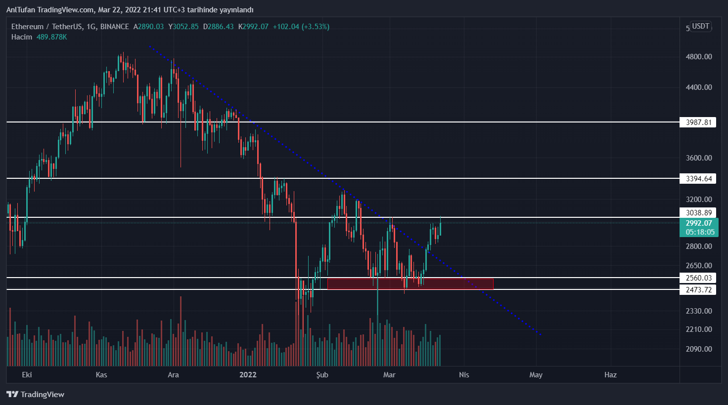 Haberimizin yazıldığı esnada 2990 dolar seviyelerinde konumlanan Ethereum, düşen trendini kırmasının ardından yükselişe başladı.