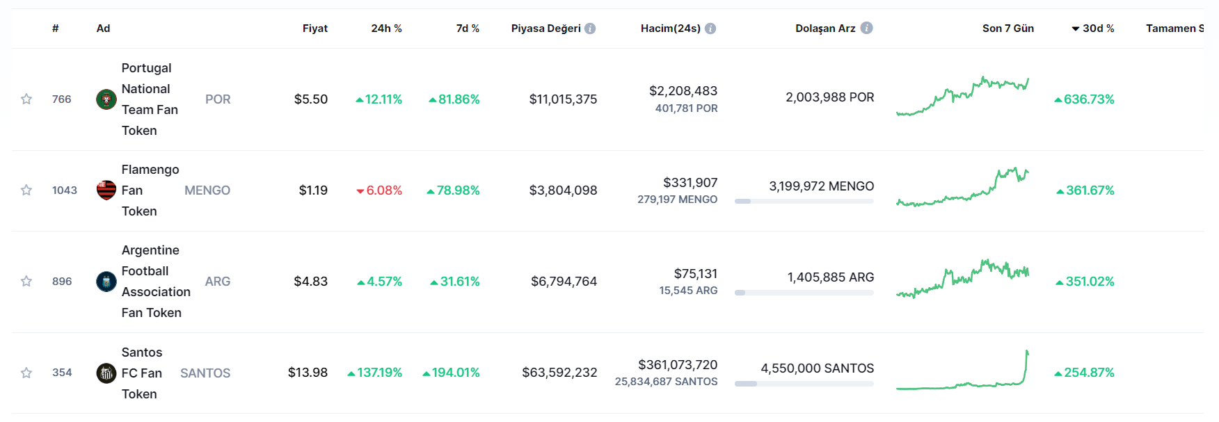 Fan tokenler arasında en sert yükselişi ise Portekiz, Flamengo, Arjantin ve Santos gerçekleştirdi. 1 ay içerisinde değerini devasa oranda artıran bu 4 altcoine gelin birlikte göz atalım: