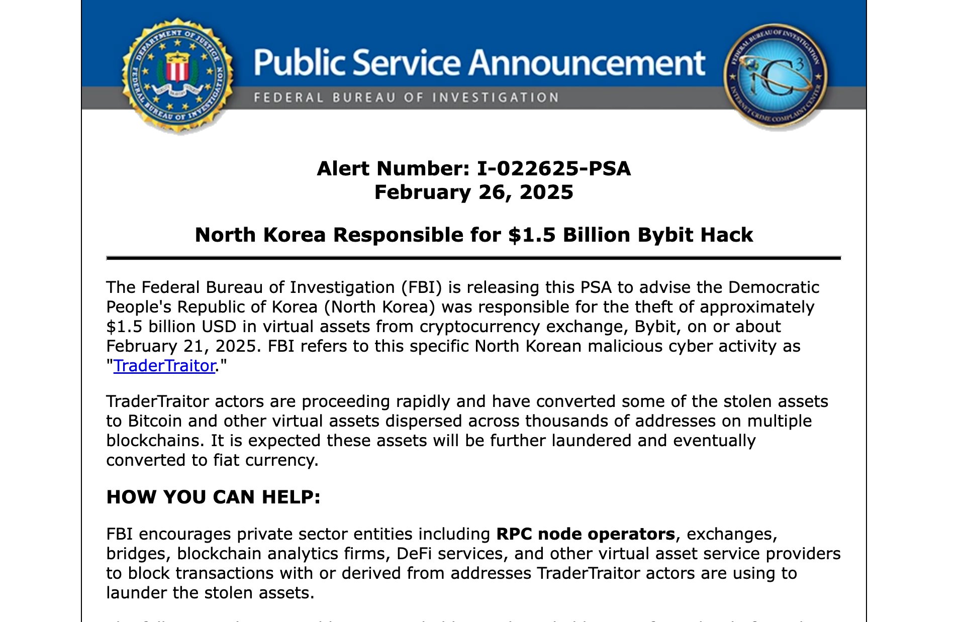 FBI’ın resmi paylaştığı duyuruya göre Bybit borsasına saldırıp 1.5 milyar dolarlık Ethereum‘u (ETH) Kuzey Kore‘de faaliyet gösteren hacker grupları çaldı.