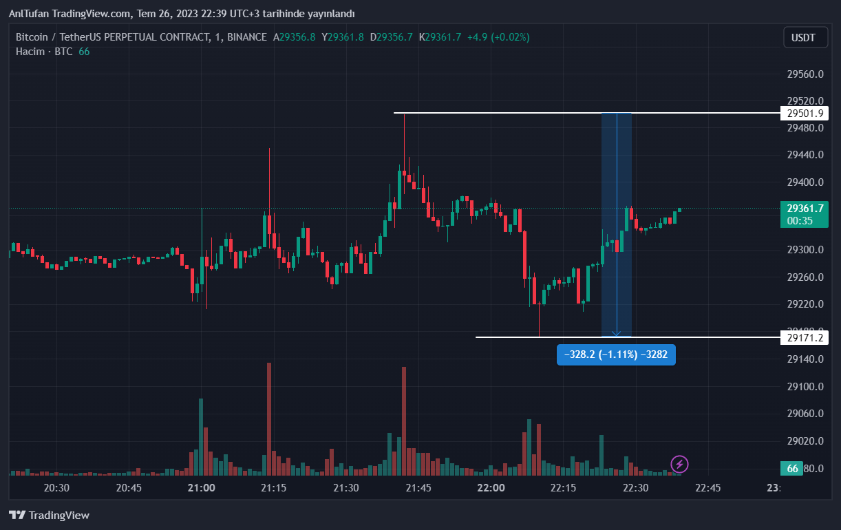 Kısa bir süre içerisinde yüzde 1.1’lik düşüş yaşayan BTC, son dakikalarda ise 29.170 dolar seviyelerinden tepki alarak yeniden 29.350 dolara yükseldi.