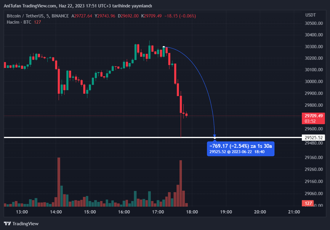 29.500 dolar seviyelerine gerileyen BTC, an itibariyle 29.700 dolar seviyelerinden işlem görüyor. İlerleyen dakikalarda Powell’ın konuşmasının şahinleşmesi, BTC’deki düşüşlerin büyümesine neden olabilir.