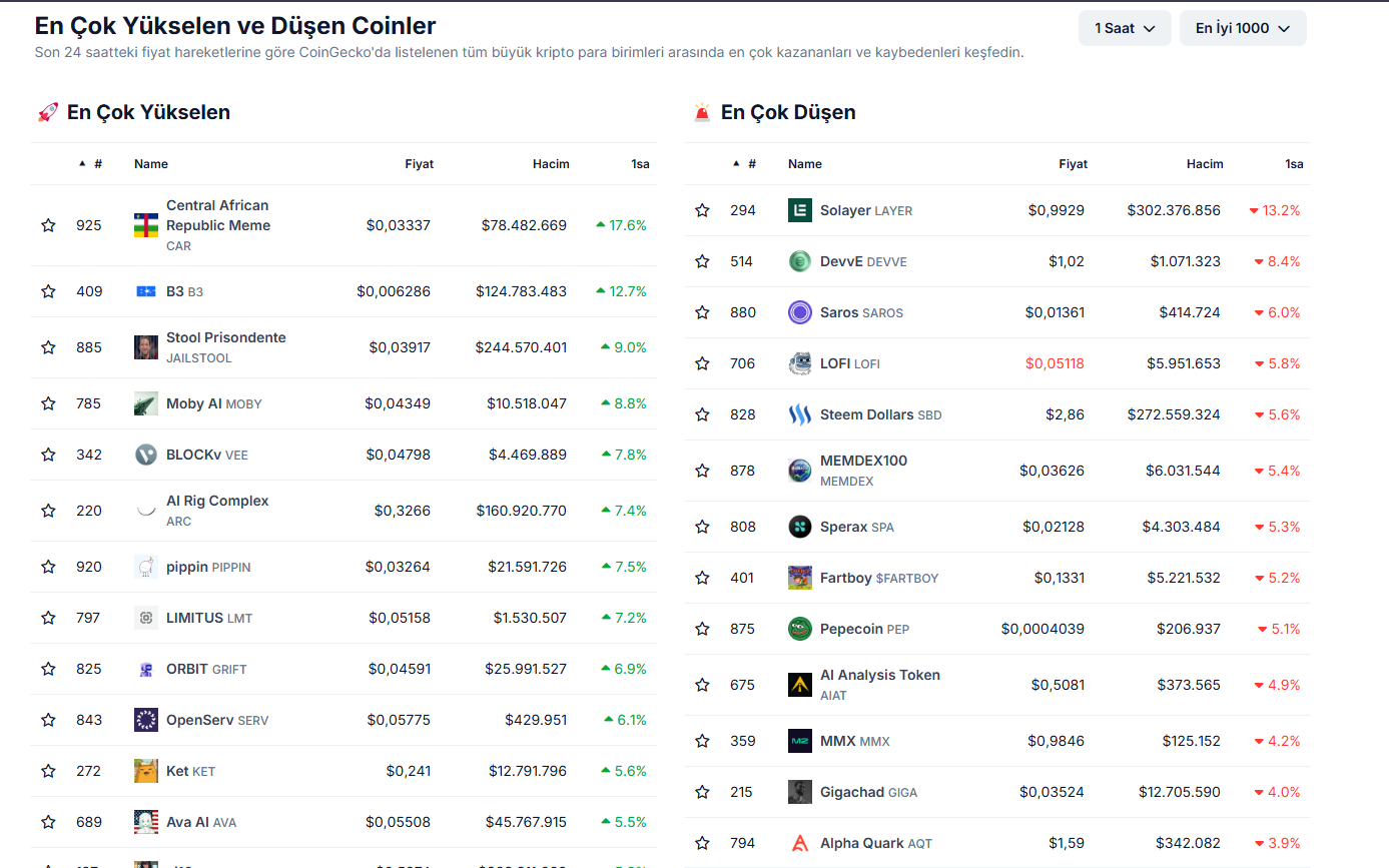 Başarılı bir veri sağlayıcısı olan CoinGecko‘nun paylaştıklarına göre son 1 saat içerisinde ilk 1.000 kripto para birimi içerisinde en büyük artışı %17 ile CAR gerçekleştirdi.