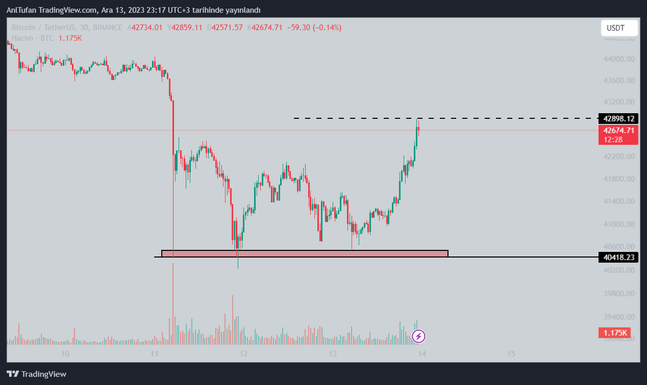 Lider kripto para birimi Bitcoin (BTC) haberimizin yazıldığı esnada 42.700 dolar seviyelerinden işlem görüyor. BTC son dakikalarda 42.900 dolara kadar yükselmeyi başardı.