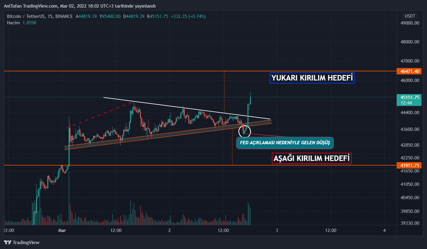 Flama hedefi olarak 46.500 dolar seviyelerine kadar yükselmesi beklenen Bitcoin’in, 45.000 dolar major direnç seviyesini kırması çok kritik gözükmekte.