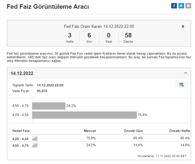Başarılı bir veri sağlayıcısı olan Investing’in aktardıklarına göre, 14 Aralık tarihinde FED yüzde 75.8 ihtimalle 50 baz puanlık bir faiz artışı gerçekleştirecek.