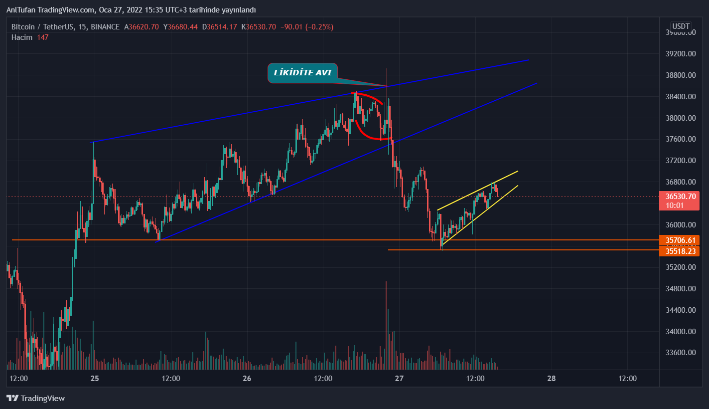 Bitcoin’e kısa vadede baktığımız 15 dakikalık grafiğimizde, trend dönüş formasyonu olarak bilinen yükselen takoz bulunuyordu. FED faizleri sabit tutmasının ardından, yukarı yönlü gelen sert iğne dahi formasyonun yapısını bozamadı.