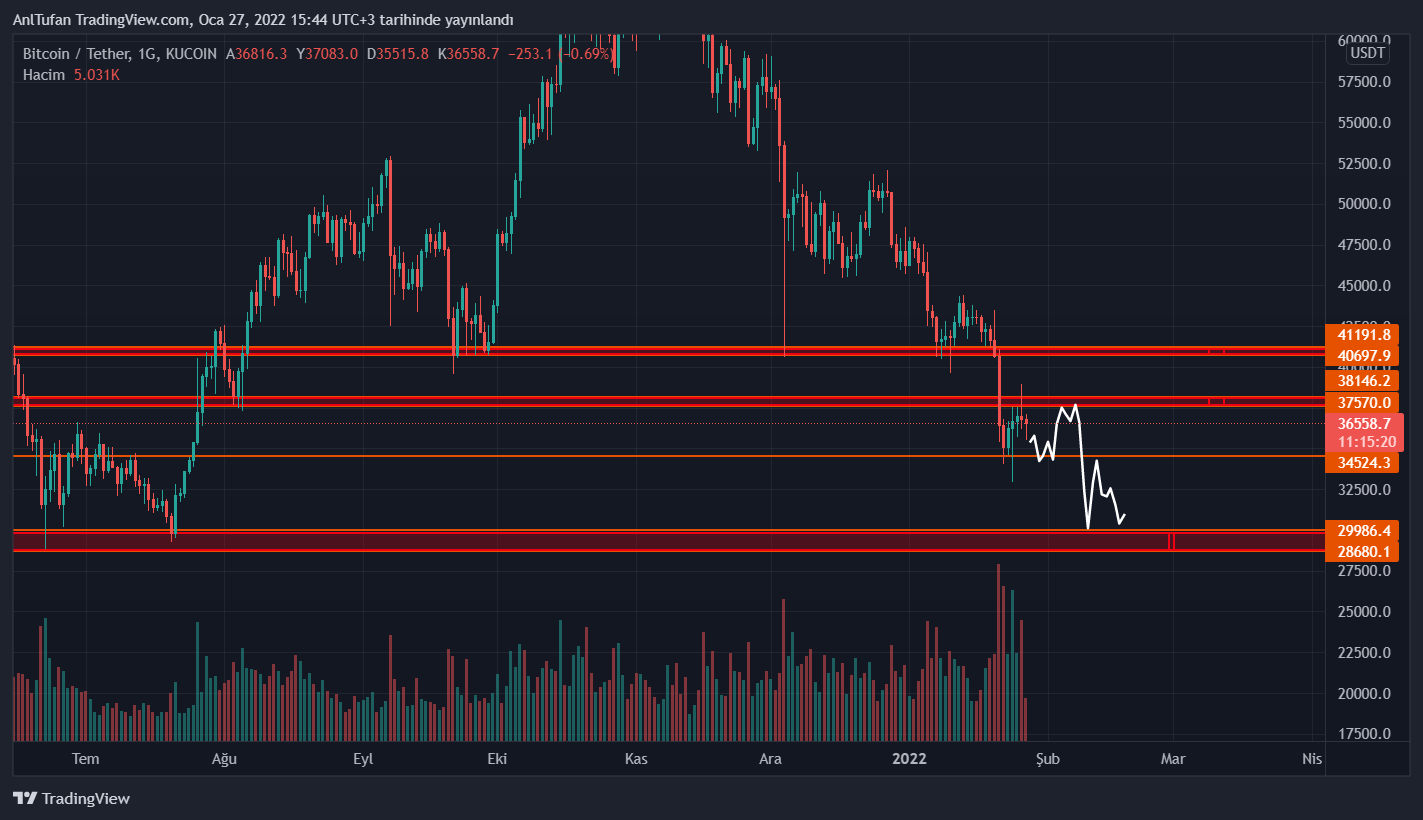 34.500 dolar ara destek seviyesine kadar geri çekilmesi çok muhtemel olan Bitcoin’in, bu ara destek seviyesinde tutunamaması halinde 28.000 – 30.000 dolar olan major destek seviyesine gerilemesi beklenecektir.