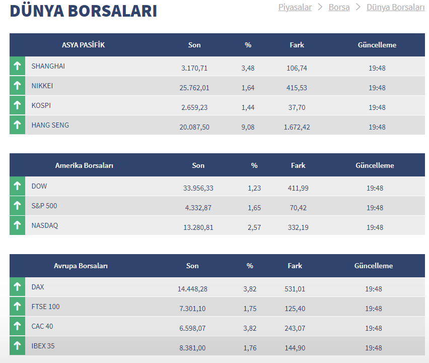 Kritik Avrupa borsa endeksleri olarak görülen DAX ve IBEX 35‘de ise bugün %3.5’a yakın oranlarda yükseliş yaşandı.