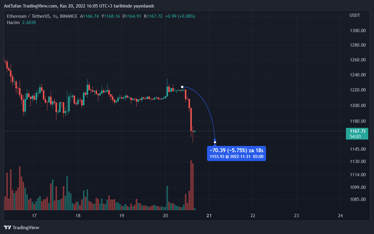 Yaşanan bu gelişmelerin ardından sonra ise lider altcoin Ethereum’un birkaç saat içerisinde yüzde 6’ya yakın düşüş yaşadığı görüldü.