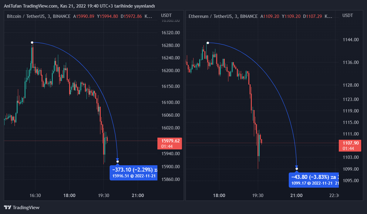 FTX hackerının aktarımları sonrasında lider kripto para birimi Bitcoin’in (BTC) 15.900 dolar noktasına kadar gerilediği görülürken, Ethereum ise 1.100 dolar seviyesine düşüş yaşadı.