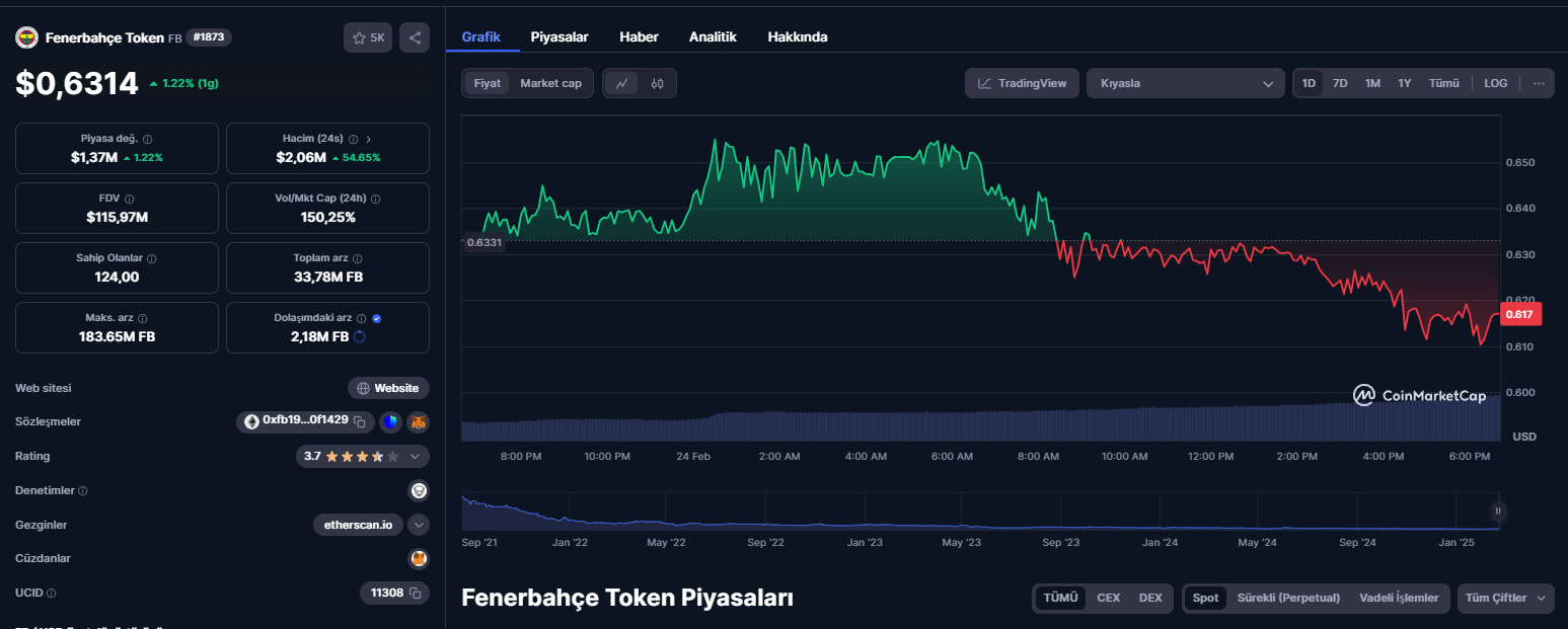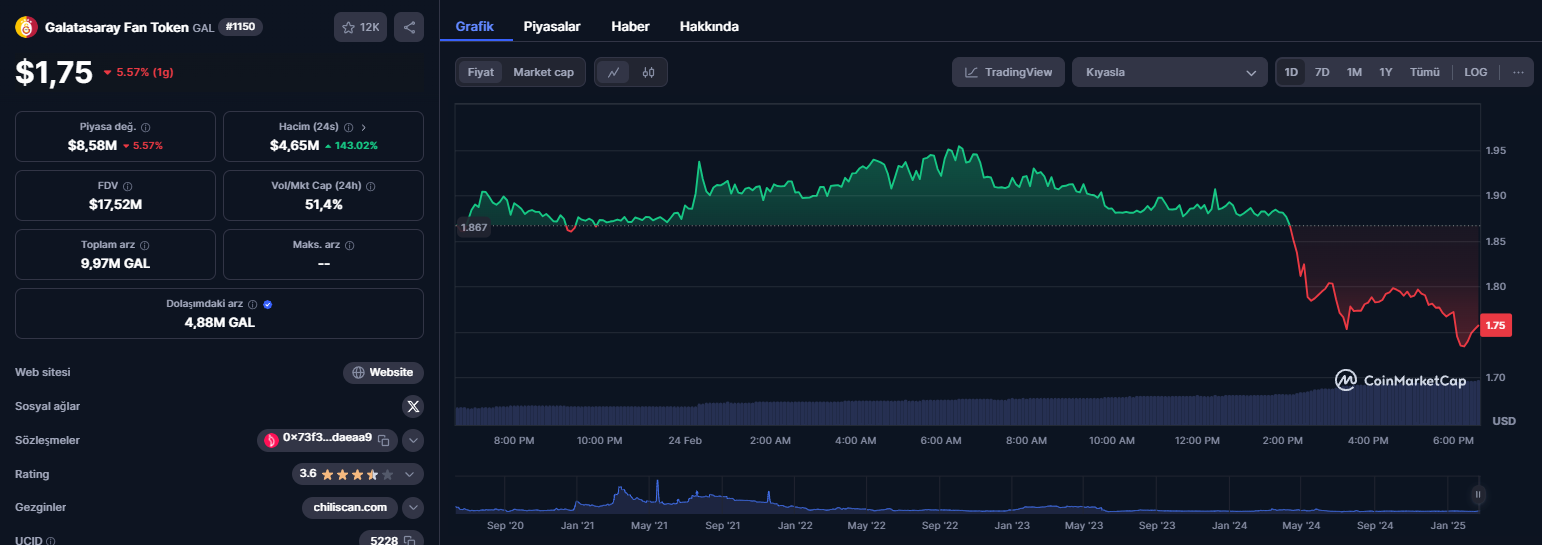 Haberimizin yazıldığı esnada GS Fan Token 1.75 dolar seviyelerinden işlem görüyor ve bugün %6 oranında değer kaybetti. FB Fan Token ise 0.63 dolardan işlem görüyor ve bugün %1.5’luk bir artış gerçekleştirdi.