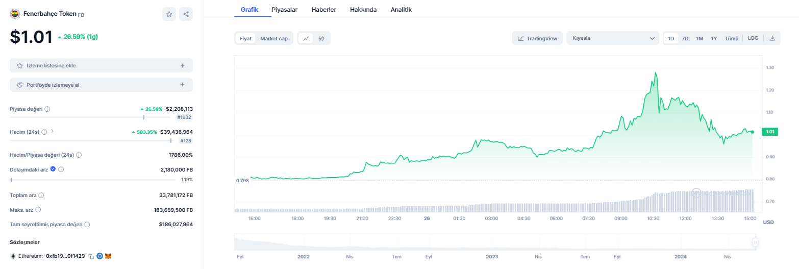 FB Fan Token‘in son hareketlerine baktığımızda, %27 oranında bir artış yaşayarak 1 dolara ulaştığı görülüyor. FB Fan Token, GS Fan Token kadar prim yapamamış durumda.