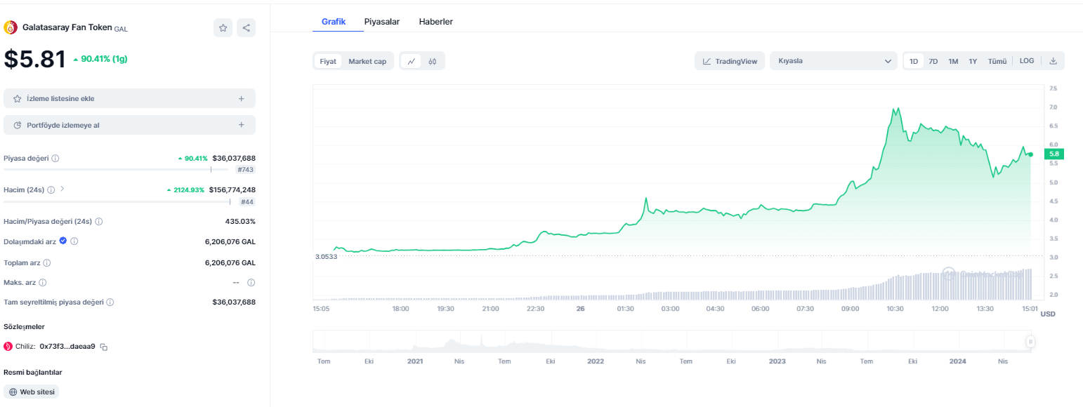 Bugün itibariyle Galatasaray ve Fenerbahçe Fan Tokenlerinde ani yükselişlerin yaşandığı görülüyor. GS Fan Token bugün %90’lık bir artış ile birlikte 6 dolar seviyelerine yaklaştı.