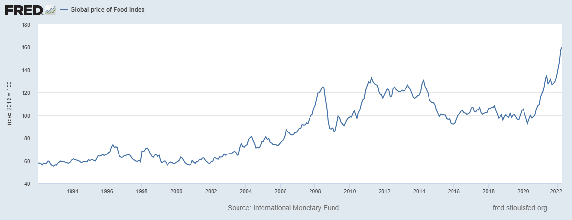 Amerikan Merkez Bankasının (FED) resmi veri sağlayıcısı olan FRED’in aktardığı son bilgilere göre, dünya üzerindeki gıda fiyatı bu zamana kadarki en yüksek seviyesine ulaştı.