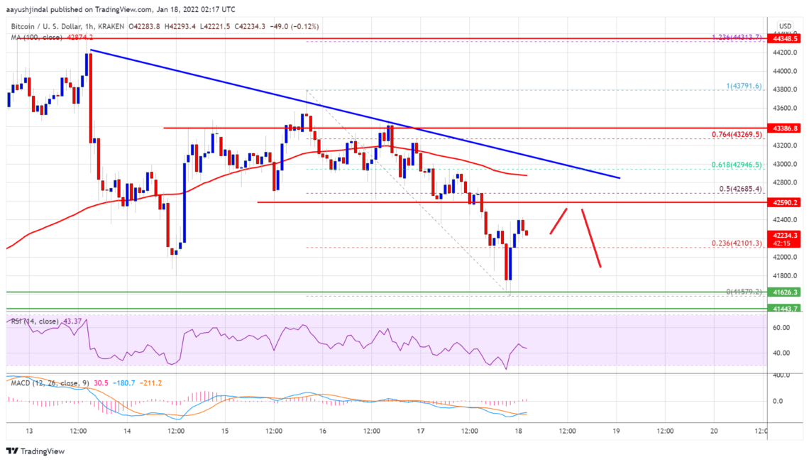 Öte yandan, Bitcoin için yükseliş umutlarının devam ettiğini gösteren 42.500 dolar ve 42.800 dolar direnç seviyesinin üzerine çıkmakta zorlanıyor. Fiyat şuanda 43.000 doların ve 100 saatlik basit ortalamanın altında (42.000 dolar) işlem görüyor.