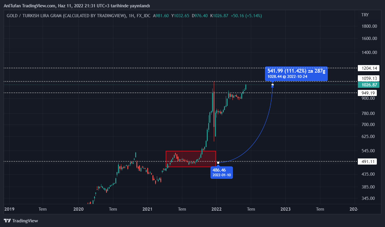 2 taraflı bir yatırım aracı olan gram altın an itibariyle 1025 Türk lirası seviyelerinden işlem görmekte. 1 sene içerisinde %111 oranında değer kazanan gram altın, yatırımcılarını sevindirmeyi başarmış durumda.