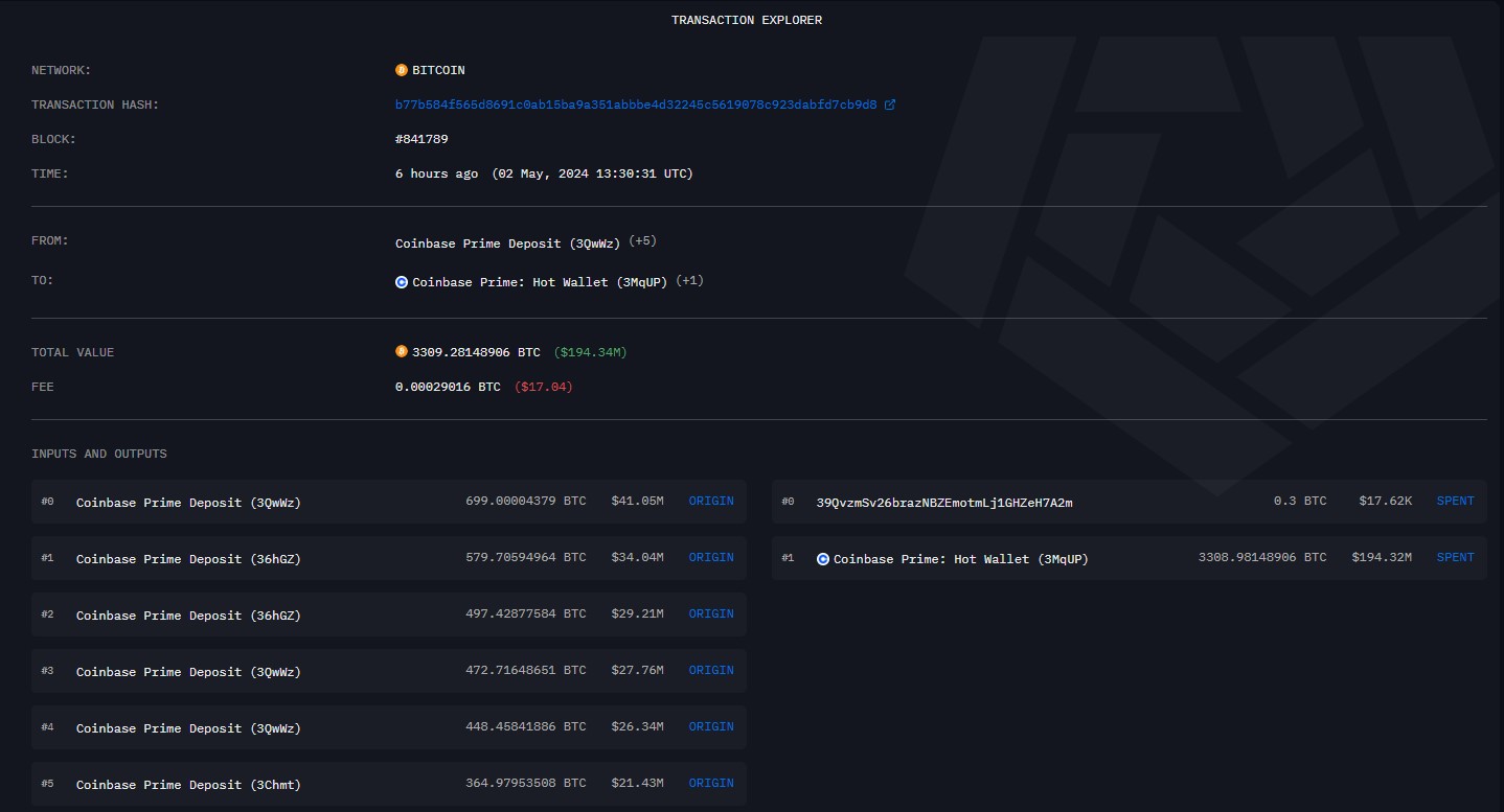 Bunlardan 194 milyon dolar değerindeki 3.308 adet BTC, Coinbase Prime sıcak cüzdan para yatırma adresine satış yapmak için aktarıldı.”
