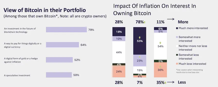 50 yaş üstü gruptaki katılımcıların %78’i Bitcoin’i enflasyona ve olumsuz ekonomik iklime karşı bir korunma aracı olarak görürken, daha genç yatırımcılar BTC’yi spekülatif ticaret için standart bir varlık olarak görüyor.