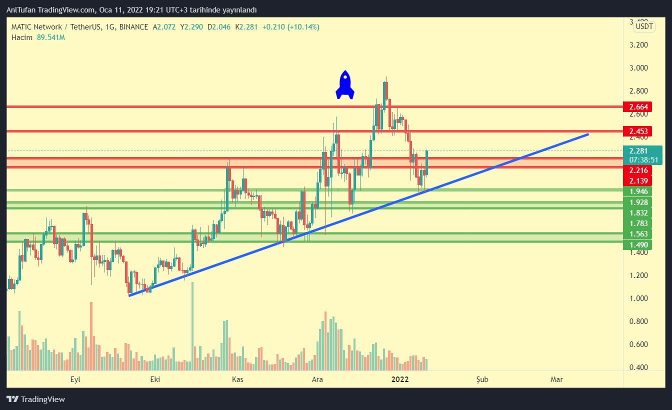 2.14 – 2.21 direnç seviyesinin üzerine çıkmayı başaran MATIC, bu direnç seviyesi üzerinde günlük kapanışlar yapması halinde yeni hedefi üst direnç bölgesi olan 2.45 dolar olması bekleniyor.