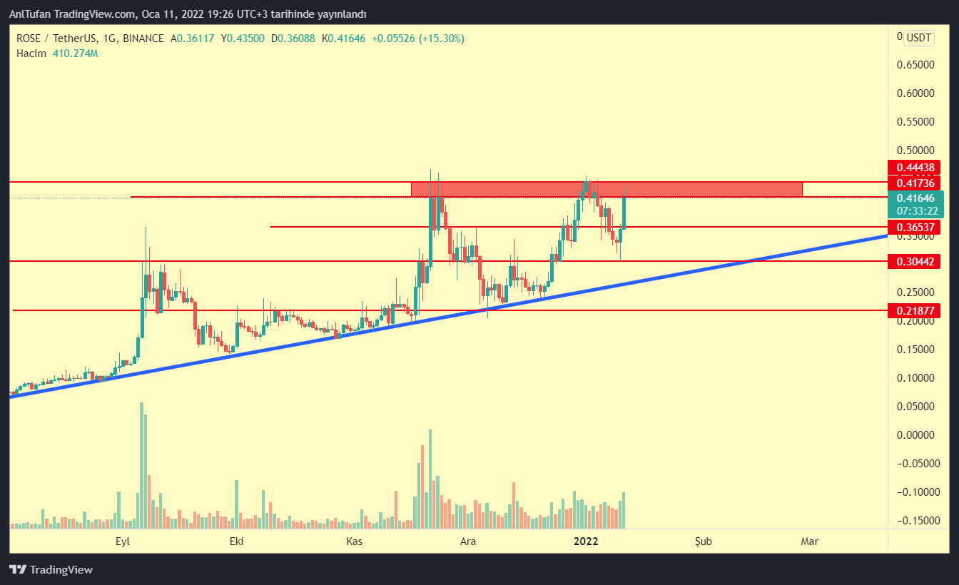 Yayın saati itibariyle 0.42 dolar seviyelerinde bulunan ROSE, bugün itibariyle yaptığı %20’lik yükselişle yatırımcıların dikkatini üzerine çekmeyi başardı. Kritik bir direnç seviyesine ulaşan ROSE, 0.41 – 0.44 direnci üzerinde kapanışlar yapması halinde sert bir şekilde fiyatlanması bekleniyor.