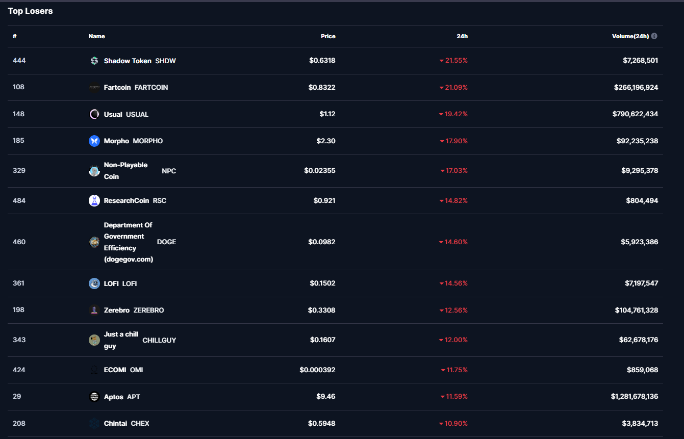 Başarılı veri sağlayıcısı CoinMarketCap’in aktardıklarına göre ilk 500 kripto para birimi içerisinde son 24 saat özelinde en çok düşüşü %21 ile birlikte SHDW isimli altcoin gerçekleştirdi.