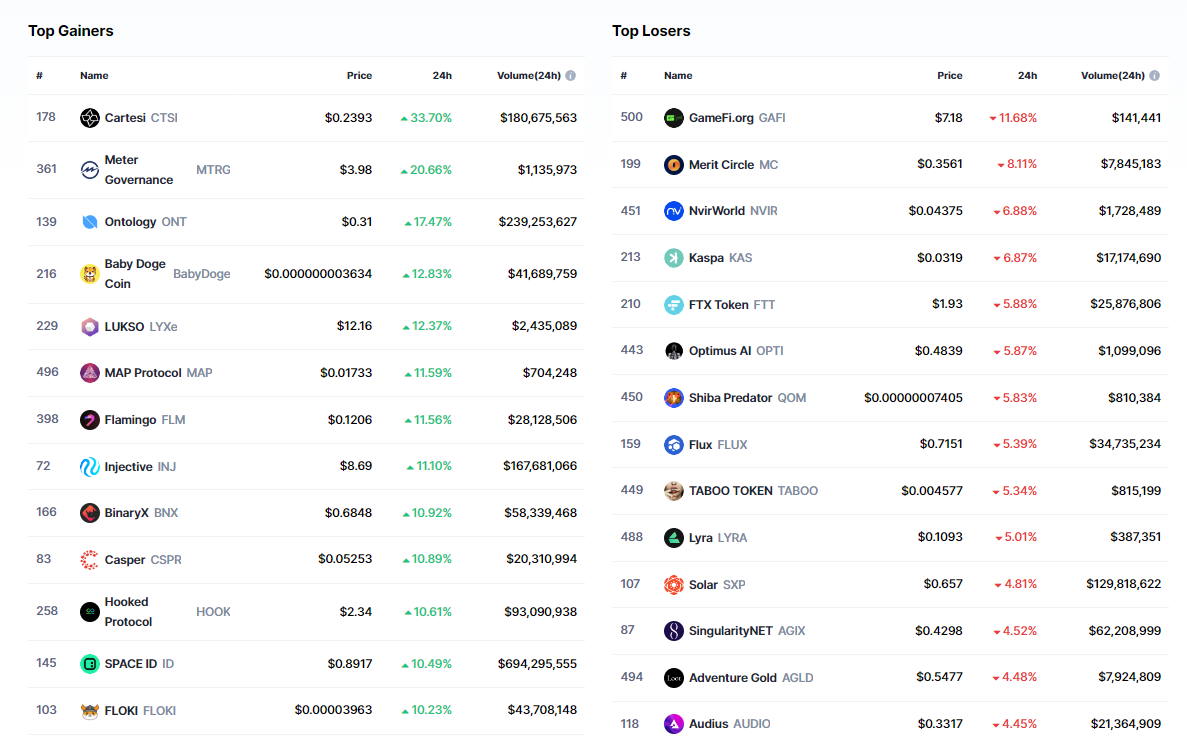 Bu hafta sonu itibariyle en büyük yükselişi CTSI isimli altcoin yaşadı. CTSI haricinde MTRG, ONT, BABYDOGE, LYXe, MAP ve FLM ciddi miktarda değer kazanmayı başardı.