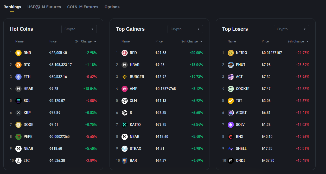 RED’in yanı sıra HBAR ve BURGER‘de bugün %10’dan fazla değer kazandı. Günün en çok düşen altcoin’leri ise NEIRO, PNUT, ACT, COOKIE ve TST oldu.
